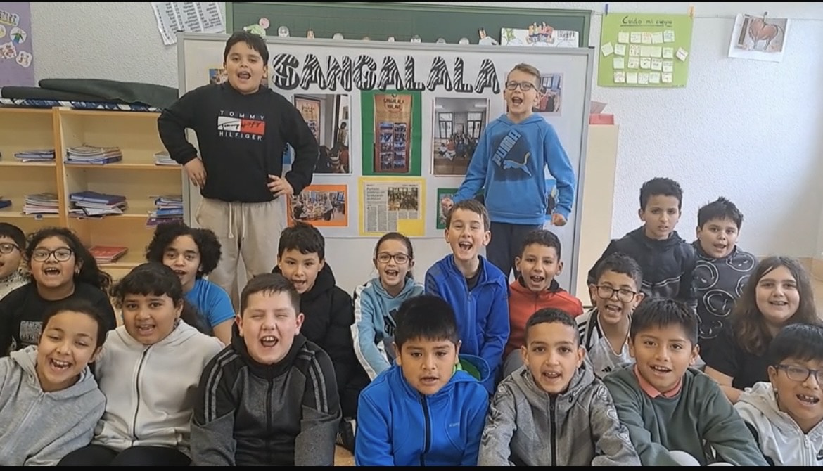 Alumnos de 4º de primaria junto al cartel de Sangalala de fondo.